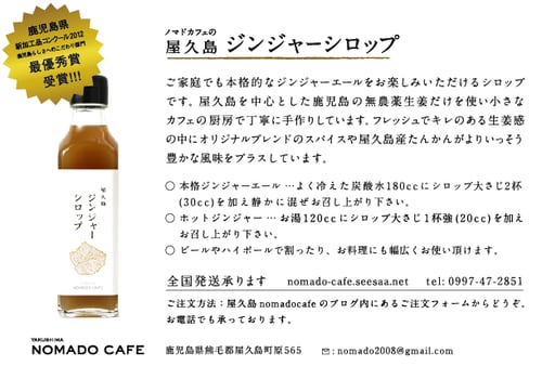 【原材料】九州産無農薬生姜、ビートグラニュー糖、種子島産きび糖、有機レモンストレート果汁、屋久島産有機たんかんピール、香辛料